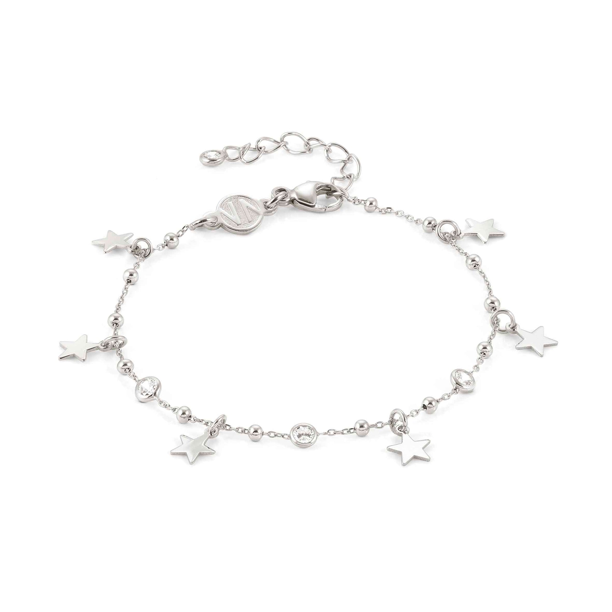 Sterling silver bracelet with white rhodium treated finish, Cubic Zirconia and Star pendants. Length: 7.25", shortens to 6".