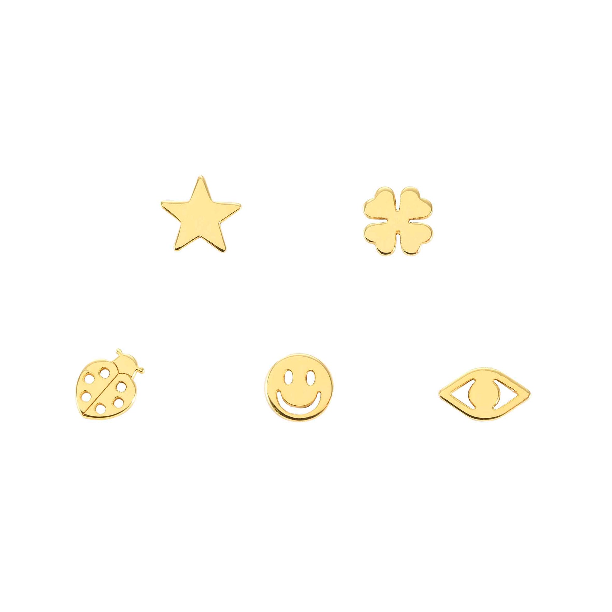 Set of 5 stud earrings in sterling silver with Mixed Symbols and 24K gold plated finish. Available symbols: Greek Eye, Four-Leaf Clover, Smile, Ladybug and Star.